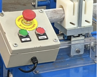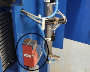 A lâmina de corte está protegida e quando aberta a proteção a energia é interrompida no disjuntor principal, há um dispositivo de segurança adicional, instalado na caixa onde a lâmina de corte está situada. Como uma característica adicional de segurança, essa chave cortará a energia e interrompendo funcionamento da máquina quando se abre a porta desta caixa.