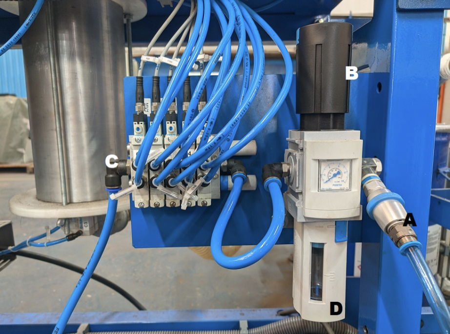 O Máquina Khrin requer ar seco para a obtenção de um ótimo resultado e garantia dos componentes pneumáticos. Se o ar comprimido não está 100% seco, recomendamos o uso de um secador de ar que deverá ser montado na linha de ar entre o compressor e a máquina.